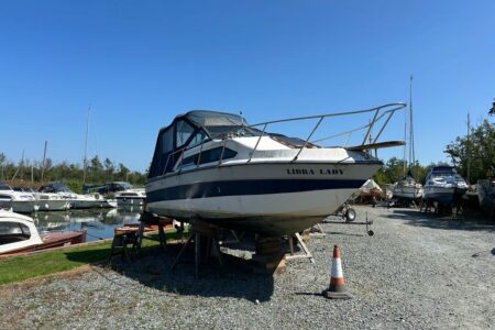 Currently Located at Cox’s Boatyard, Norfolk Broads, Staithe Rd, Barton Turf, Norwich, NR12 8AZ, laid up on land as in last photo. 5.7 litre V8 Mercruiser Engine, good runner as in video. Was located inland on the River Nene at Titchmarsh Middle Nene Cruising Club and suited to rivers / open water navigations.